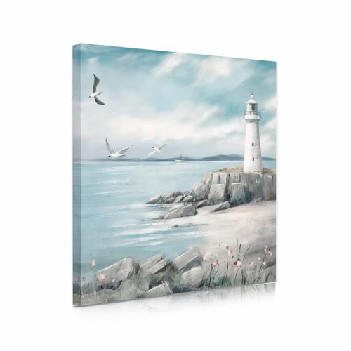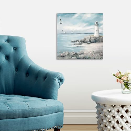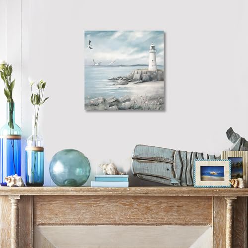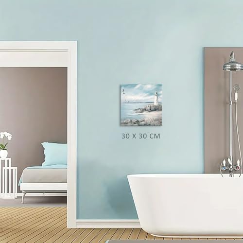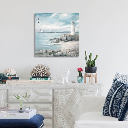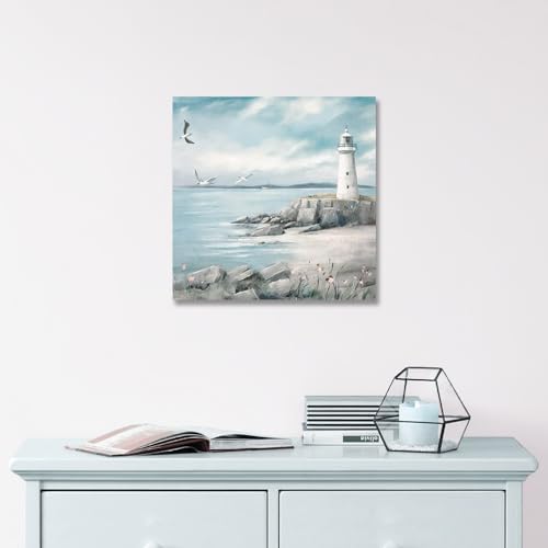XMYATELi - لوحة فنية جدارية بتصميم منارة من اكسمياتيلي: مطبوعة على القماش بتصميم منارة وطيور نورس فوق المحيط وطابع بحري هادئ للحمام أو غرفة النوم أو المكتب أو المعيشة، صغير 30×30 سم مع إطار جاهز