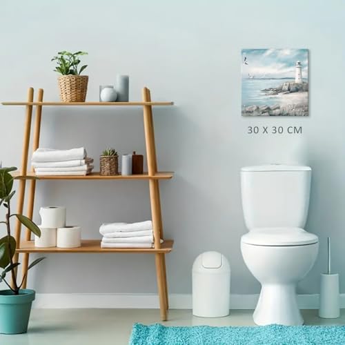 - مشهد ساحلي هادئ: يبلغ مقاس كل صورة منارة 30 سم عرضًا × 30 سم ارتفاعًا لكل لوحة. هذه اللوحة الجدارية للحمام بتصميم منارة تجسّد إطلالة بحرية هادئة، وتتميز بمنارة وحيدة شامخة بين الصخور والأمواج المتلاطمة.