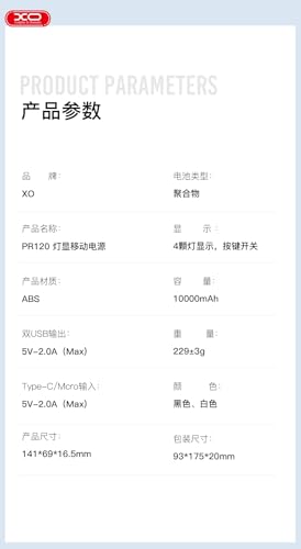 XO - شاحن باور بنك PR120 من اكس او ببطارية سعة 10000 مللي امبير في الساعة مع مؤشر LED مضيء - اسود، 10000.0 أمبير ساعة، الليثيوم