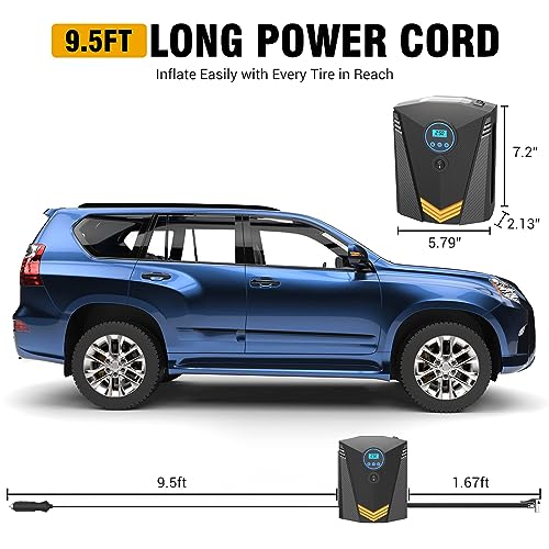 - نفخ سريع مع سلك طويل 9.5 قدم: الحد الأقصى لضغط ضاغط الهواء هو 150 باوند لكل انش مربع، يمكن ملء الإطارات بحجم 195/65R15 في 3-5 دقائق فقط (28-35 باوند لكل انش مربع). ما عليك سوى قلب المفتاح وسيقوم ضاغط نفخ الإطارات بكل العمل نيابة عنك. يبلغ طول السلك 9.5 قدم ويمكنك الوصول بسهولة إلى كل إطار دون متاعب.