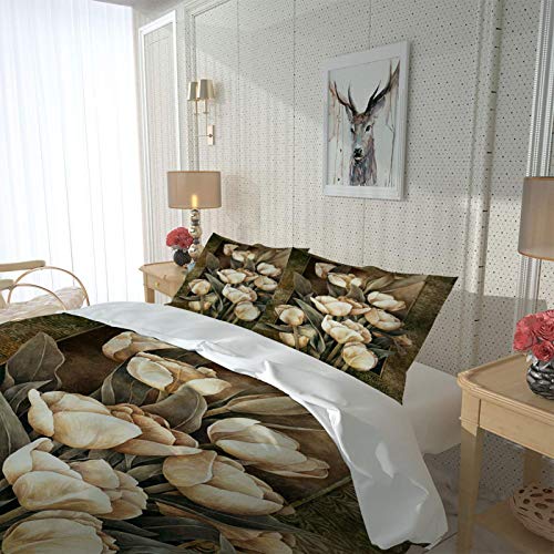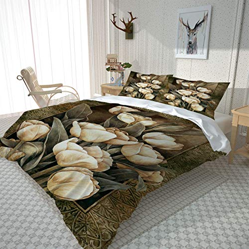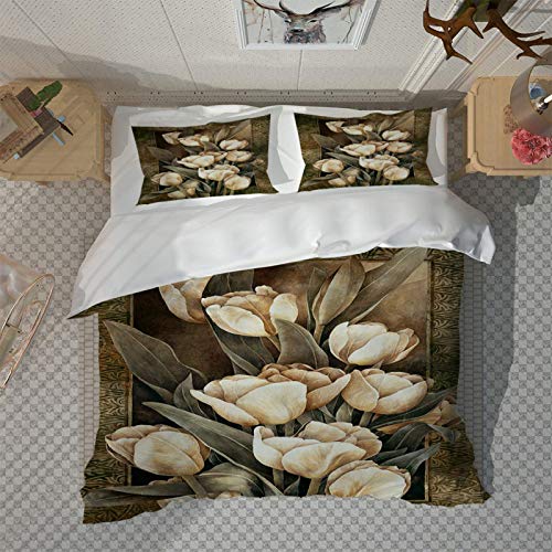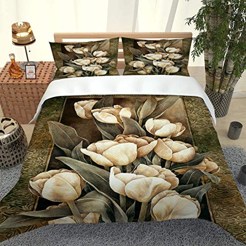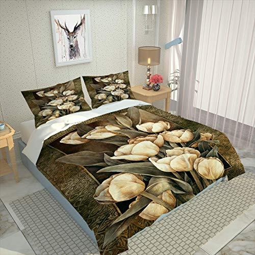 XOYKX - طقم غطاء لحاف مايكروفايبر فائق النعومة لا يسبب الحساسية مطبوع ثلاثي الأبعاد مقاس سوبر كينج من اكسويكس - طقم سرير من 3 قطع بنمط توليب مع سوستة إغلاق 260×240 سم + كيسين وسادة، ذهبي، من XOYKX