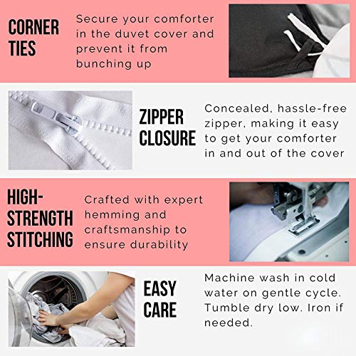 - سهلة العناية: مقاومة للانكماش والبهتان، مما يجعل طقم اللحاف هذا سهل العناية. يمكن غسلها في الغسالة بالماء البارد، وتجفف بالمجفف على درجة منخفضة ولا تستخدم المبيضات. لن تصبح أغطية اللحاف صلبة أو تتوبر بعد الغسيل - لا مزيد من الرحلات باهظة الثمن إلى المنظفات الجافة.