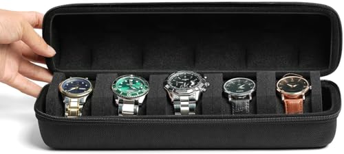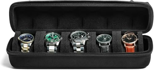 Xpandio - حافظة سفر صلبة بـ5 فتحات لتخزين وتنظيم الساعات للرجال والنساء مع مخدة ساعة مضادة للحركة من اكسبانديو، أسود