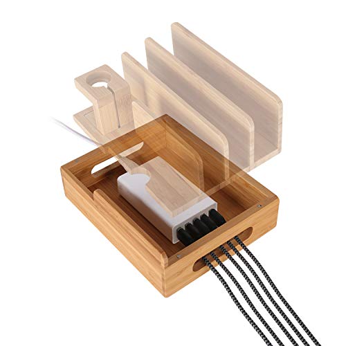 XPhonew - قاعدة شحن سطح المكتب متعددة الاجهزة من خشب الخيزران من اكس بي هونيو متوافقة مع ايفون 14 13 12 11 برو ماكس اكس اس ماكس اكس ار اكس 8 7 ايباد ابل ووتش / اي ووتش 2 3 4 سامسونج الذكية، يو اس بي