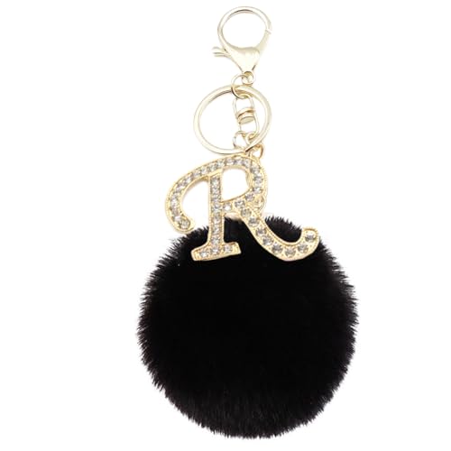 Xsclpomddy - سلسلة مفاتيح بوم بوم من اكس اس سي ال بومدي مصنوعة من الفرو الصناعي بلون اسود مع حجر الراين بتصميم حروف ابجدية للنساء والفتيات