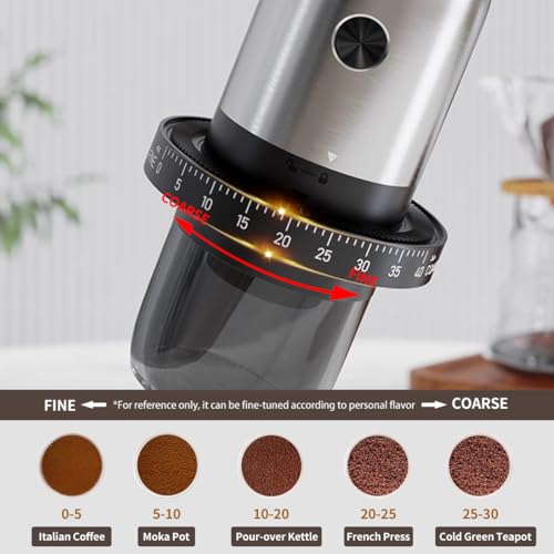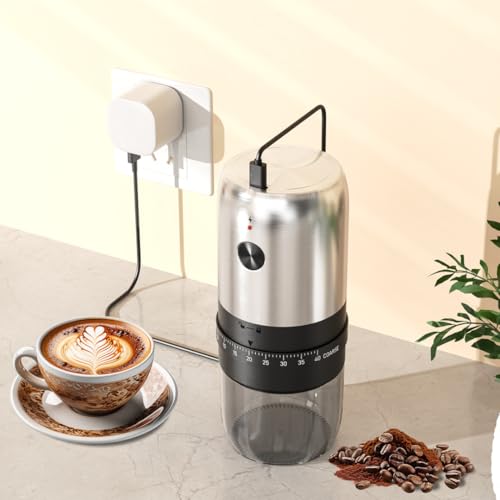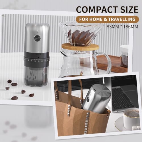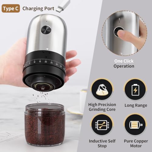 XVersion - مطحنة قهوة كهربائية محمولة مع 40 إعدادًا قابلًا للتعديل للطحن (من الخشن إلى الناعم)، تعمل بالشحن عبر منفذ نوع سي، مناسبة للاستخدام في المنزل/السفر/التخييم/المكتب/الإسبريسو، سعة 35 جرامًا (لون فضي)