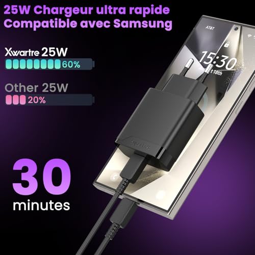 Xwartre - شاحن سريع 25 واط متوافق مع سامسونج جالاكسي S24 FE S23 S22 S21 S25 S20 A22 A06 A05 A16 A15 A56 A55 A54 A36 A34، محول USB C بمقبس رئيسي للهاتف مع كيبل بطول 5 قدم