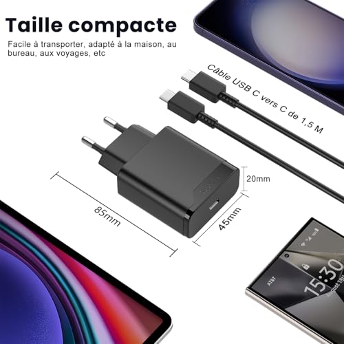 - شاحن سريع: جهد الدخل 110 - 240 فولت، بروتوكول PPS، جهد الخرج التكيفي 3 فولت - 12 فولت. شاحن يو اس بي نوع سي وكابل سريع يسمح بشحن جهاز جالكسي الخاص بك بالكامل في بضع عشرات من الدقائق. (متوافق مع سامسونج ايه اف سي 15 وات) بي دي 3.0 يوفر طاقة خرج قصوى تبلغ 25 واط