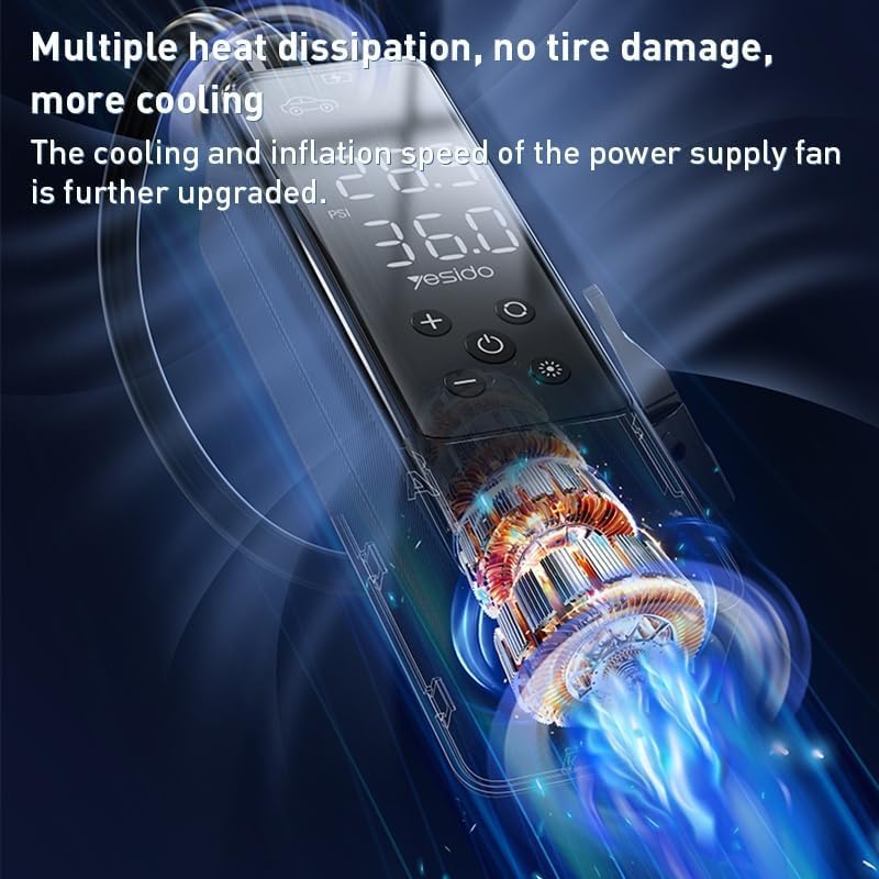 - ضاغط منفاخ هواء صغير سلكي محمول للسيارة يسيدو VC05، المادة: بلاستيك ايه بي اس + بولي كربونات، الطاقة: 50W، الجهد: تيار مستمر 10.5V- 16V/ 10A (كحد أقصى) الحد الأقصى للتيار الكهربائي: 85W (كحد أقصى)، إضاءة ليد: 100lm، نفخ بمفتاح واحد يتوقف تلقائيًا عند الامتلاء، مريح وخالي من المتاعب. استخدامات متعددة: لإطارات السيارات القبالة لإعادة النفخ والموتوسيكلات والدراجات الهوائية والسيارات الكهربائية والكرات، إلخ. الموديل: VC05، بلد المنشأ: الصين