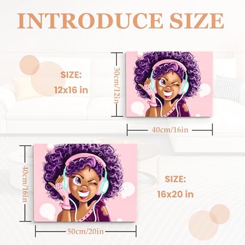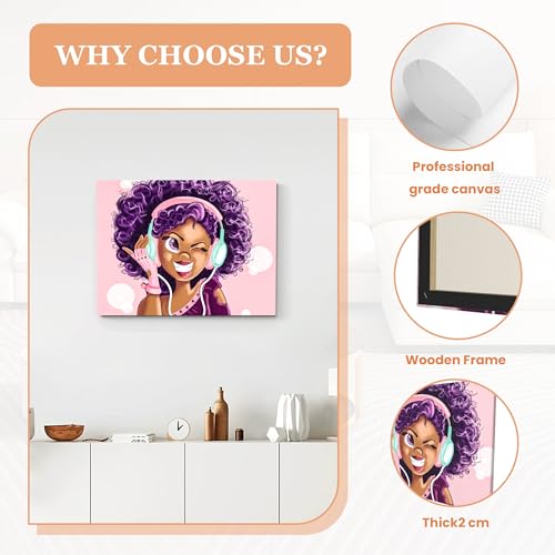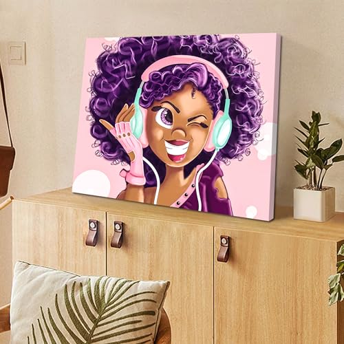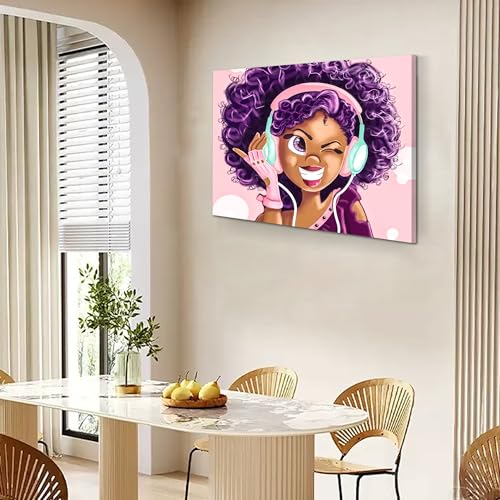 Yagizaul - لوحة فنية جدارية من القماش برسمة فتاة أمريكية أفريقية تعشق الموسيقى بشعر أرجواني سحري لديكور غرفة البنات وغرفة النوم والمعيشة جاهزة للتعليق من ياجيزول، وردي، 30 × 40 سم