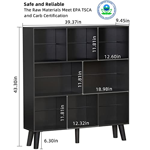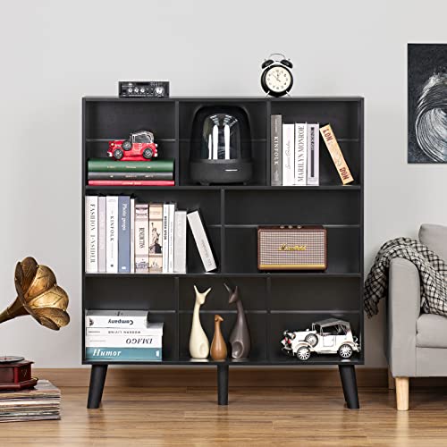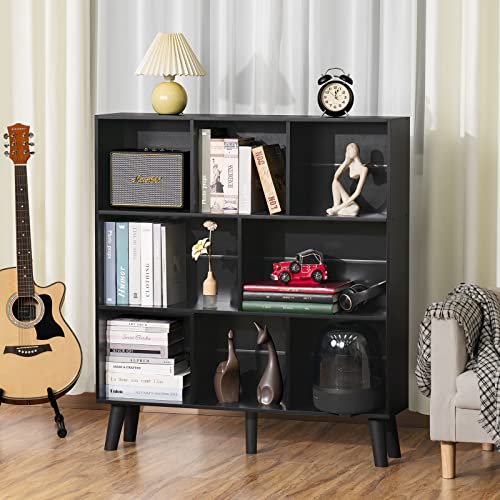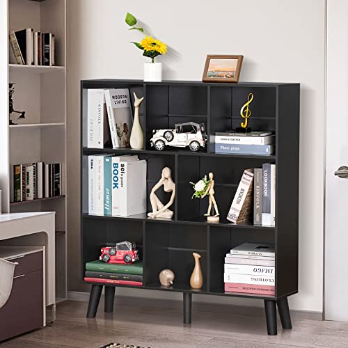 YAHARBO - ياهاربو رف كتب بـ8 مكعبات خزانة من 3 طبقات مع ارجل ارفف عصرية سوداء بتصميم منتصف القرن منظم تخزين مفتوح قائم بذاته خشبية طويلة لغرفة النوم وغرفة المعيشة والمكتب