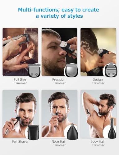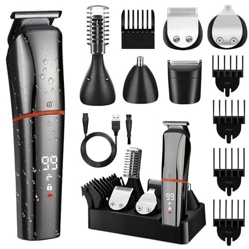 Yakiter - ماكينة تشذيب شعر ولحية للرجال 6 في 1 مقاومة للماء وقابلة لإعادة الشحن بمنفذ USB، مجموعة متعددة الوظائف من 10 قطع لتشذيب شعر اللحية والوجه والأنف والأذن من ياكيتر