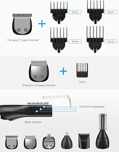 - 【مجموعة تشذيب احترافية متعددة الوظائف 11 في 1】 ماكينة التشذيب المتكاملة رائعة لجميع أنواع حلاقة شعر الوجه: ماكينة قص الشعر وتشذيب اللحية، أداة تشذيب للاهتمام بالتفاصيل الشعر وتشذيبه والتركيز على التفاصيل في اللحية والسوالف ولحية الذقن وشعر الأنف وغيرها من شعر الوجه والجسم. مجهزة بـ 6 أمشاط توجيه (3/6/9/12 ملم لماكينة التشذيب بالحجم الكامل، 1/2/3/4 ملم لماكينة التشذيب الدقيقة، 2/3/4 ملم لماكينة تشذيب الجسم) مما يتيح لك خيارات أكثر لقص تسريحتك.