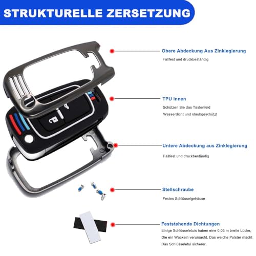 - إشارة قوية: أربع طبقات من الحواف المعدنية المزخرفة الأمامية والخلفية وأغطية الألومنيوم الأمامية والخلفية تحمي مفتاح السيارة بزاوية 360 درجة، حماية قوية جدًا، ولكنها لا تؤثر على إشارة التحكم عن بعد على الإطلاق.