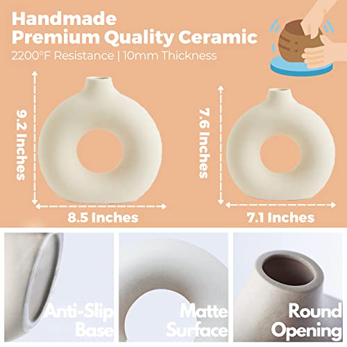 yanwe1 - فازات سيراميك لديكور المنزل، مجموعة من 2 فازة بنمط دونات، فازة عصرية، فازة لعشب البامباس، فازة بنمط ريفي، فازة مزخرفة، فازة بوهو دائرية لرف الكتب والطاولة والمدفأة، بلون أبيض من يانوي 1
