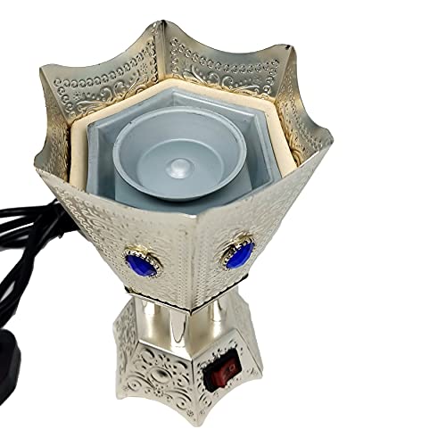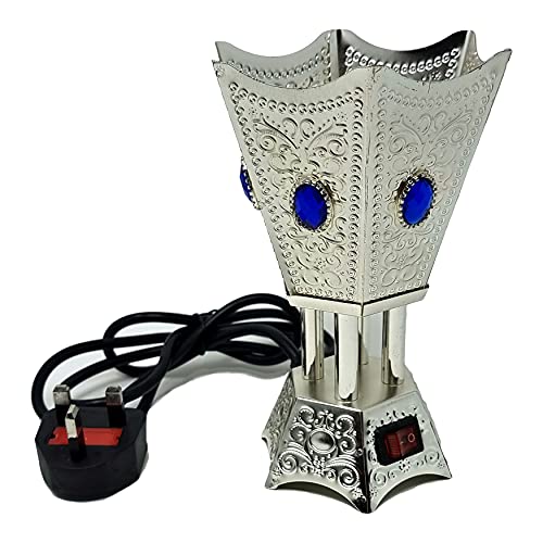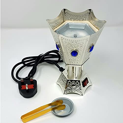 Yaqeen - مبخرة كهربائية ذات تصميم ملائم لرقائق خشب العود العربي ومسحوق عود البخور وراتنج لبان الدكر - مرفقة بفيشة بريطاني (فضي)