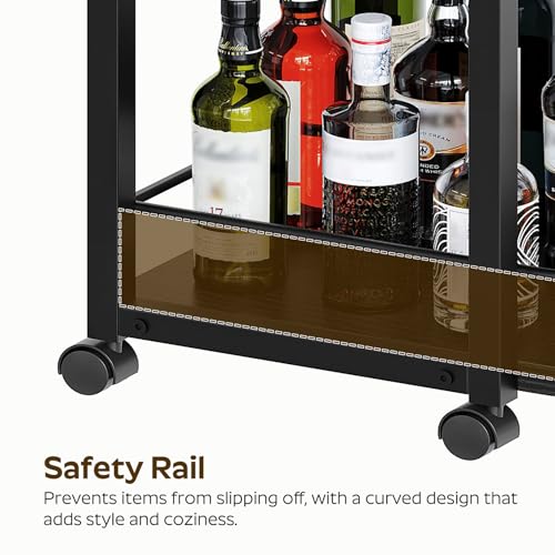 - مقبض وقضبان أمان: تتميز عربة البار المنزلية بمقبض سهل الإمساك لسهولة الحركة تمنع قضبان الأمان الموجودة على الأرفف الثلاثة عناصر مثل زجاجات النبيذ والأواني الزجاجية من الانزلاق، مما يضمن العرض والاستخدام الآمن