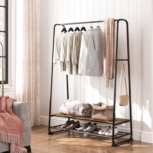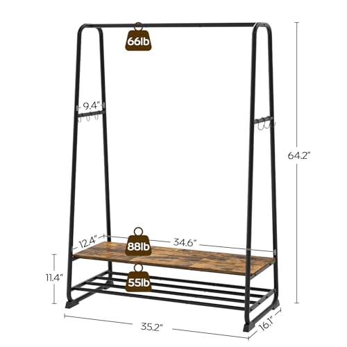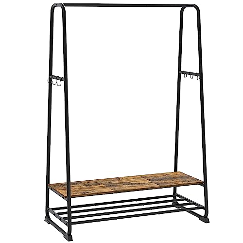 YATINEY - رف ملابس من ياتيني، رف ملابس لتعليق الملابس، رف ملابس صناعي مع رفين و6 خطافات على شكل حرف S، اطار معدني، لغرفة النوم، المدخل، بني ريفي واسود، GR45BR، حديد خشبي مصمم هندسيًا