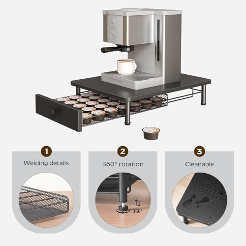 - مساعد تخزين جيد: يمكن لسطح المكتب الخشبي وضع آلات القهوة أو أكواب القهوة، ويمكن للرف الشبكي من نوع الدرج مع مسار سلس تخزين 35 كيسًا من كبسولات القهوة. كل شيء في متناول اليد وسطح الطاولة الخاص بك منظم