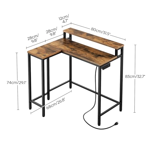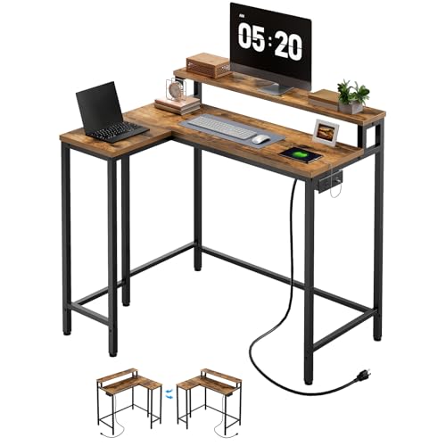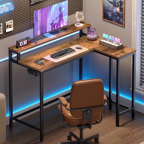 YATINEY - مكتب كمبيوتر DN05UBR منزلي على شكل حرف L مع منافذ طاقة، مكتب ألعاب مع حامل شاشة قابل للتعديل للدراسة وغرفة الألعاب أو غرفة المعيشة، لون بني (Rustic) وأسود من ياتيني