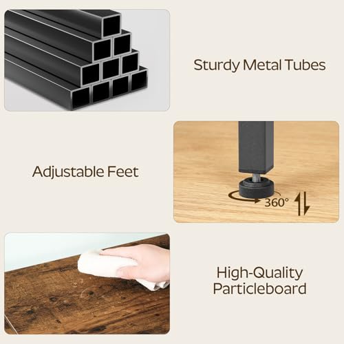 - صُمم ليدوم طويلًا: مكتبة الزاوية هذا مصنوع من إطار معدني ولوح خشب متين، لضمان الاستدامة والقدرة العالية على تحمل الأحمال الكبيرة. مزود بأربع قواعد قابلة للتعديل لتثبيت المكتب على الأرض غير المستوية، كما تضمن مجموعة منع الانقلاب ثبات المكتب لتعزيز الأمان.