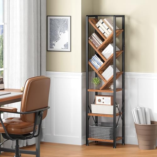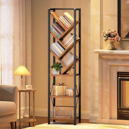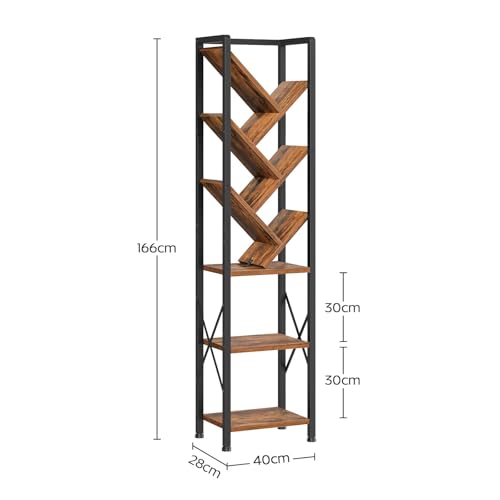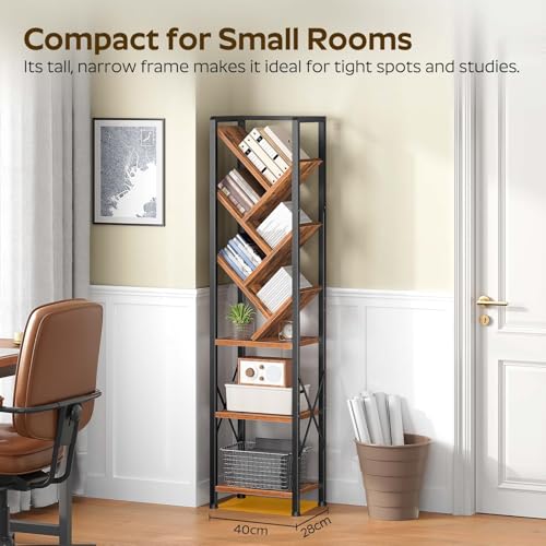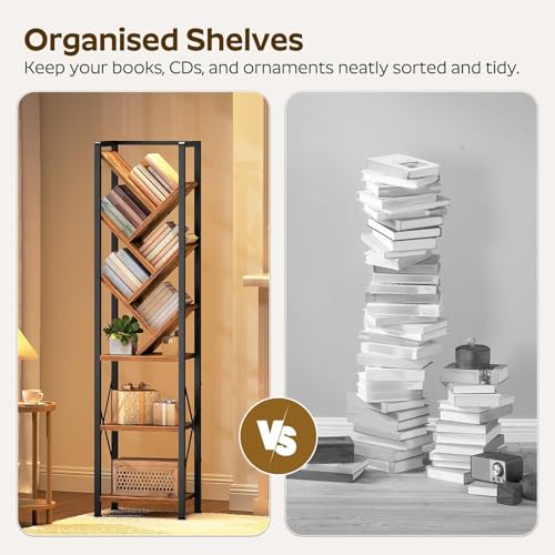 YATINEY - رف كتب بتصميم شجرة من ياتيني، خزانة كتب ضيقة موفرة للمساحة مع 3 ارفف مسطحة، منظم للكتب والديكور، رف صغير قائم على الارض للدراسة وغرفة المعيشة والمكتب، بني ريفي XSJ11BR