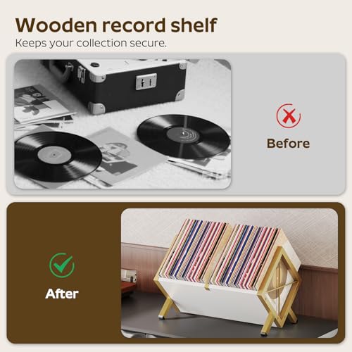 - صُمم ليدوم طويلًا: تم تصنيع حامل أسطوانات الفينيل هذا من خشب هندسي عالي الجودة ومعدن متين، مما يمنحه متانة واستقراراً استثنائيين. يضمن حامل أسطوانات الفينيل الممتاز هذا بقاء مقتنياتك آمنة من الانحناء أو السقوط، مما يجعله إضافة موثوقة وعملية لأي غرفة.