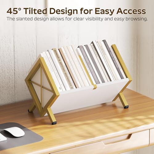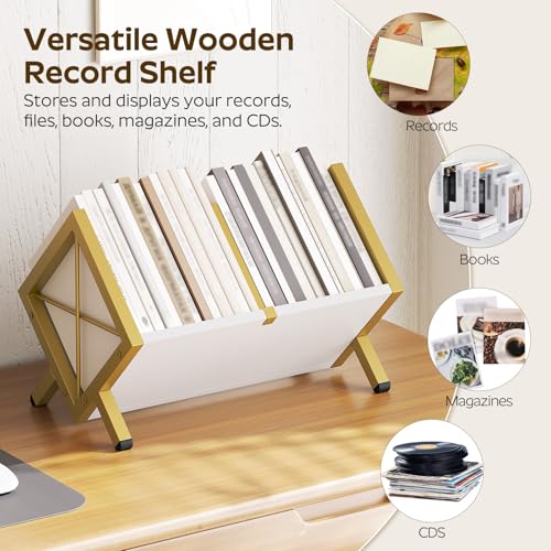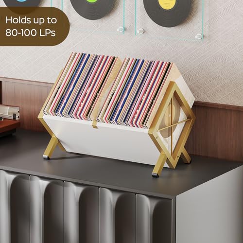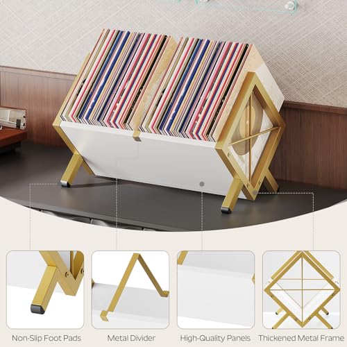 YATINEY - حامل أسطوانات الفينيل CJ06DW لتنظيم من 80 إلى 100 أسطوانة رف تخزين مصنوع من الخشب والمعدن لعرض الأسطوانات منظم سريع التجميع لCD والكتب من ياتيني أبيض وذهبي