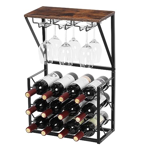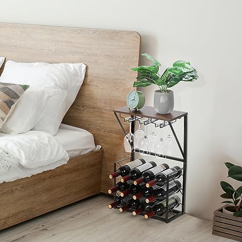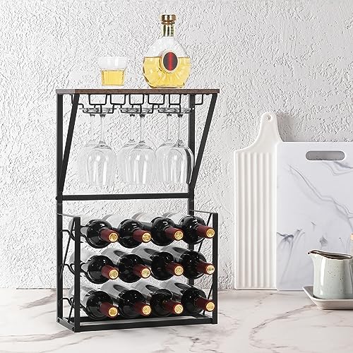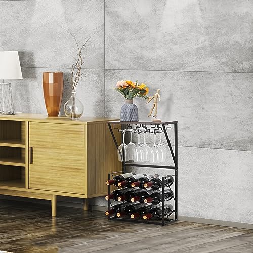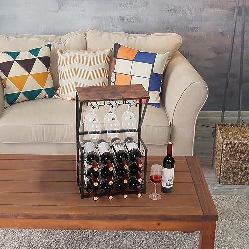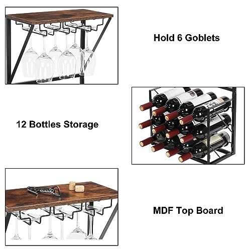 YBING - واي بينج رف مشروبات قائم بذاته مكون من 3 طبقات يتسع لـ 12 زجاجة مع 6 اكواب نبيذ، خزانة مشروبات قائمة بذاتها للمنزل والمطبخ والبار وقبو النبيذ والخزانة واللوح العلوي