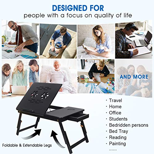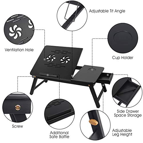 Ybj-ake - طاولة لاب توب من الخيزران متعددة الاستخدامات، صينية فطور بأرجل قابلة للطي، مزودة بحامل كوب ودرج تخزين علوي مائل من Ybj-ake، لون أسود (أسود)