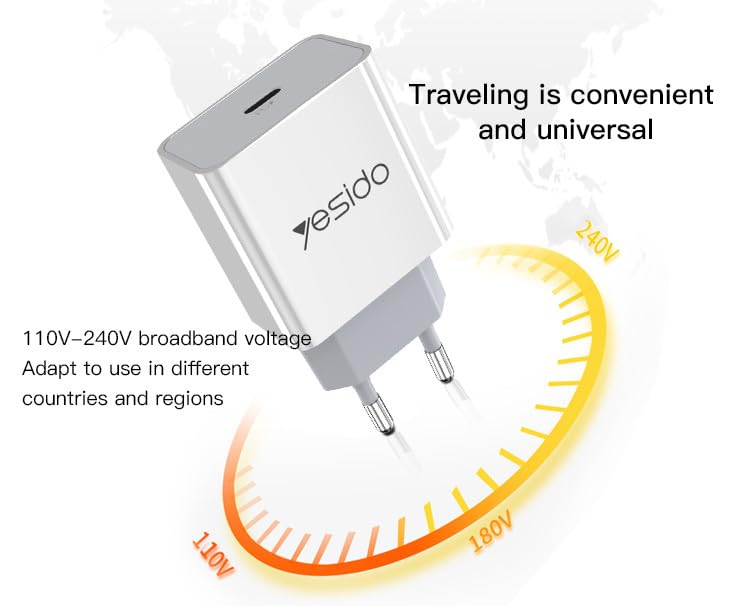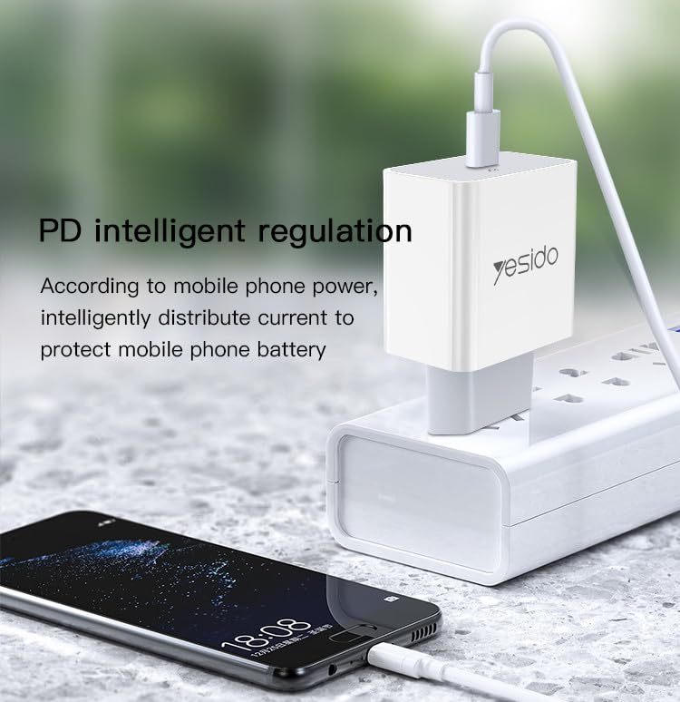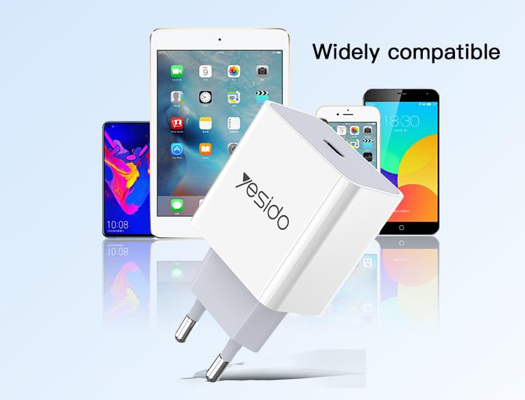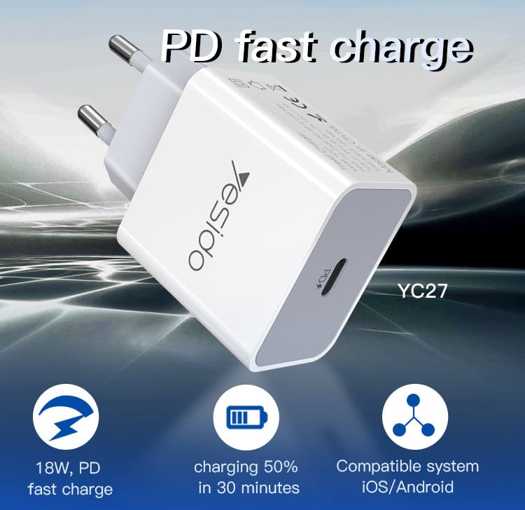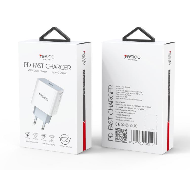 Yesido - محول YC27 أبيض بمقبس الاتحاد الأوروبي PD2.0 18 واط لشحن الهواتف الذكية بسرعة وشاحن محمول للسفر