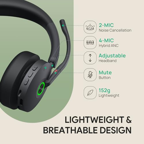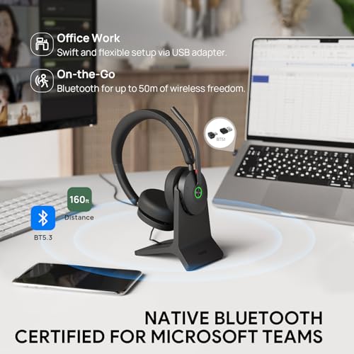 Yealink - سماعة رأس لاسلكية BH74 مع حامل بخاصية إلغاء الضوضاء النشطة مع ميكروفون للعمل من يالينك، 6 ميكروفونات هايبرد ايه ان سي مايكروسوفت تيمز بريميوم اوبن اوفيس معتمدة بلوتوث 5.3، تحدث حتى 32 ساعة