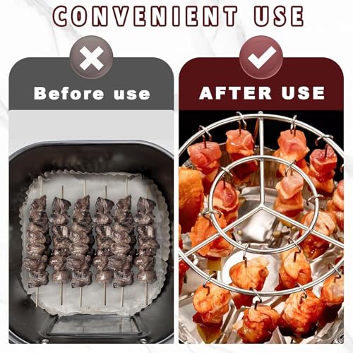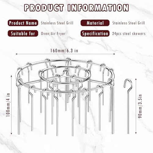 - ✨️【مساحة طهي واسعة】 الحجم المتوسط لهذا الرف المستدير للقلاية الهوائية: أبعاد الرف المستدير للقلاية الهوائية: 16 × 16 × 10 سم، مزود بـ24 سيخ من الفولاذ المقاوم للصدأ قابلين للإزالة بطول 9 سم، ما يجعله مناسب لمختلف سيناريوهات الطهي ويلبي احتياجاتك المتنوعة. مزود بقاعدة مخصصة للخضروات في الأسفل لتثبيت الشواية وتحقيق أفضل النتائج.