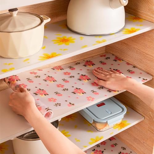 - 【نمط زهرة الأقحوان】: تم تصميم بطانة الرف هذه بنمط زهرة الأقحوان، مما يجعل خزائن المطبخ المنزلية وخزائن تخزين الطعام والأدراج وأسطح الطاولات وما إلى ذلك مزينة بشكل أكثر جمالاً، مع جعل الجزء الداخلي من ثلاجتك يبدو مشرقًا ومرتبًا.