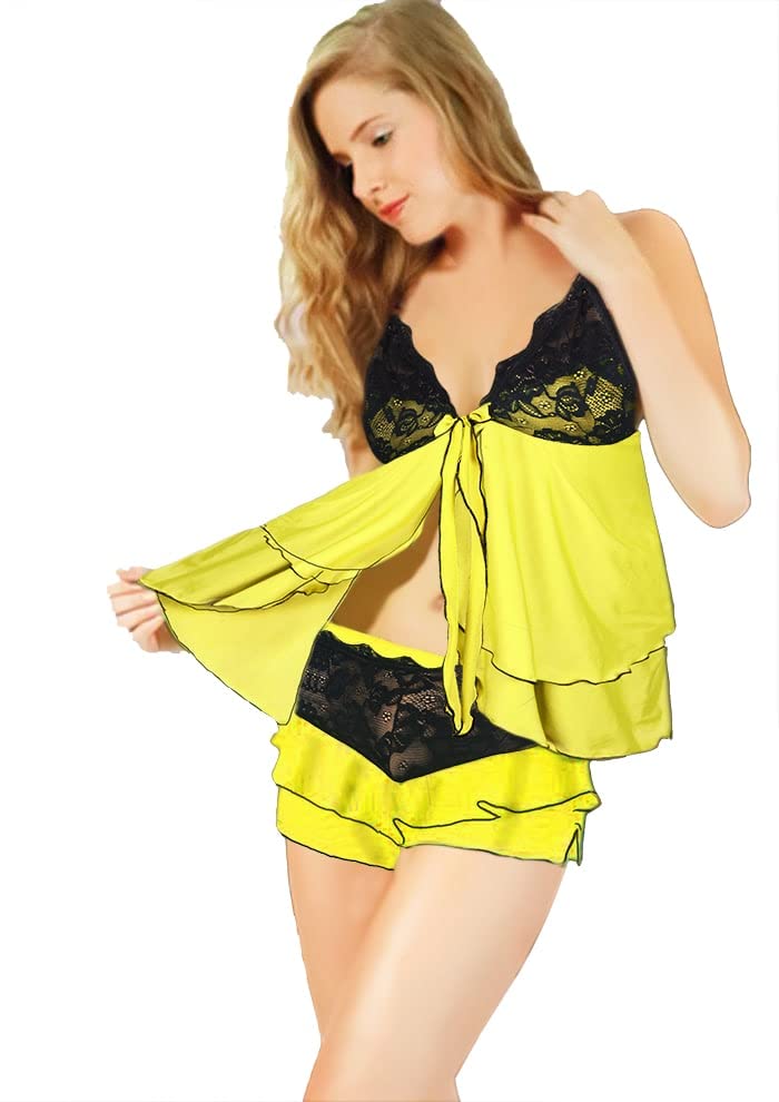 Generic - لانجيري بحواف دانتيل صفراء للنساء، اسود