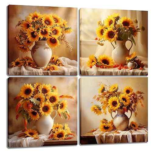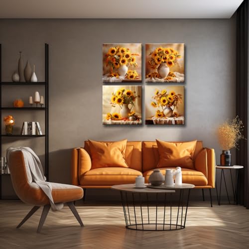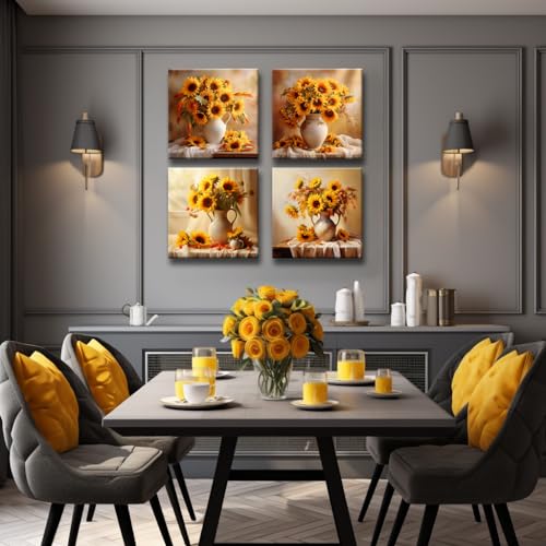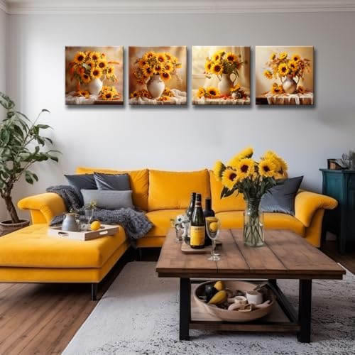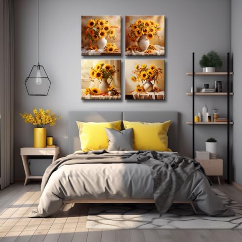 ZHJLUT - لوحة فنية جدارية قماشية بتصميم زهرة عباد الشمس بلون اصفر - 4 لوحات مزهرية - صور حائط المطبخ لتزيين غرفة المعيشة - هدية للفتيات المراهقات والنساء 12 × انش اطار جاهز للتعليق في المنزل والمكتب