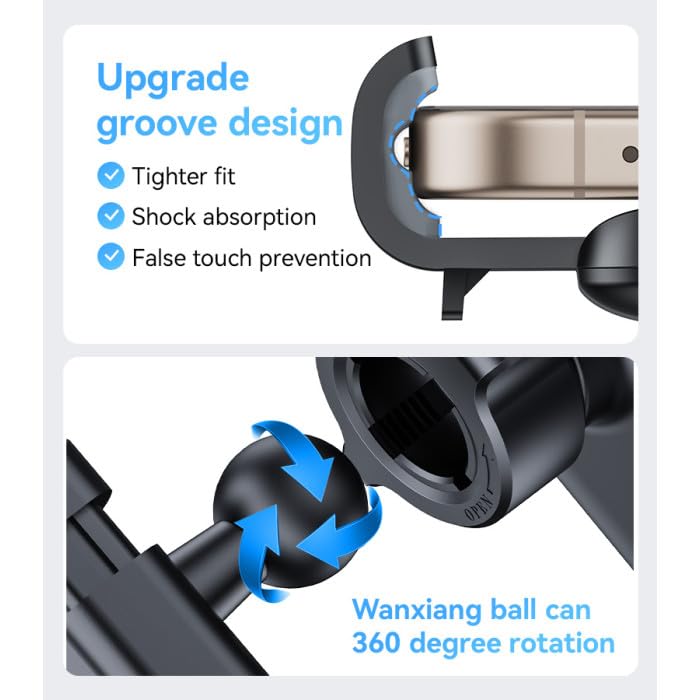 - تشغيل بيد واحدة: راحة بدون مجهود: يتيح لك زر الفك السريع والآلية المرتبطة بالجاذبية أو المُحملة بنابض (للتحقق من نوع الآلية) تركيب موبايلك وإزالته بسهولة بيد واحدة فقط، مما يضمن قيادة أكثر أمانًا.