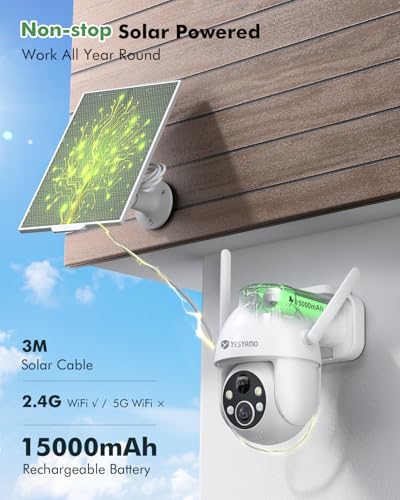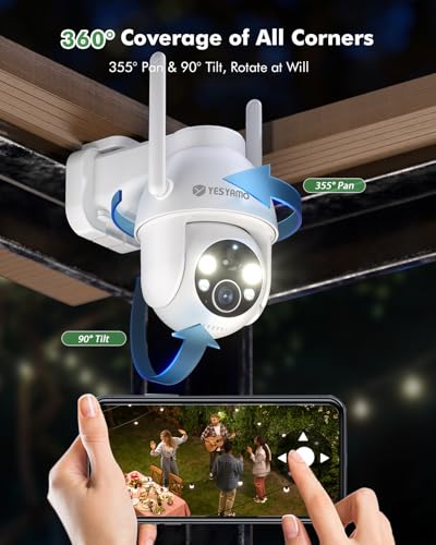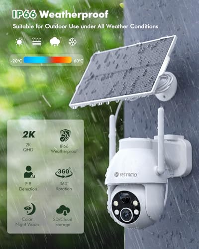 YESYAMO - كاميرا مراقبة لاسلكية تعمل بالطاقة الشمسية 360 درجة بي تي زد من يسيامو شمسية 2K QHD بالبطارية قابلة لاعادة الشحن مع كشف الإنسان PIR واي فاي 2.4 جيجاهرتز منبه صوتي وضوء اليكسا أبيض