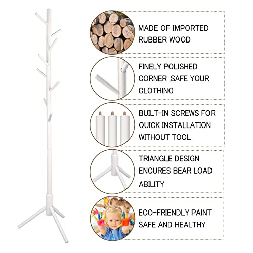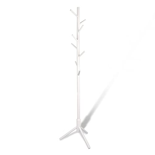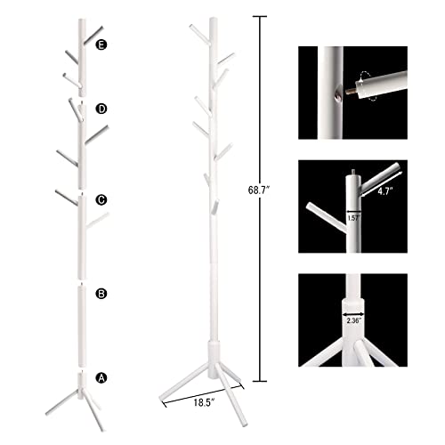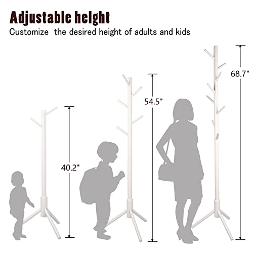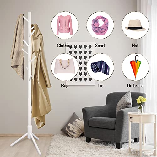 YEVONNIE - حامل معاطف خشبي مطاطي مع 8 علاقات، 3 مقاسات قابلة للتعديل، سهل التجميع لا يحتاج إلى أدوات، حامل شماعات معطف قائم بذاته للمعاطف والملابس والقبعات والمظلات والمكتب وغرفة النوم من ايفوني، لون أبيض