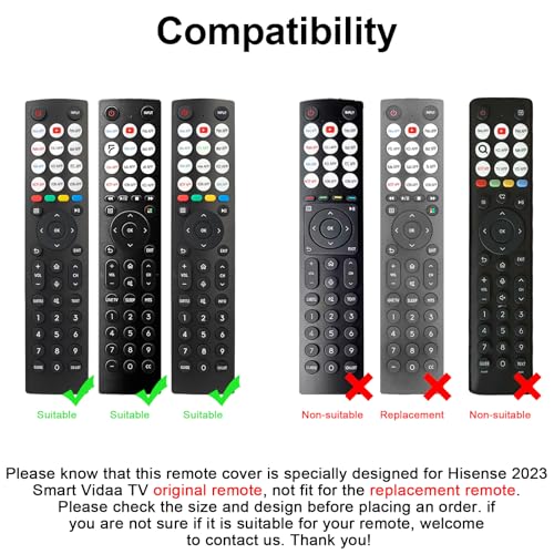 - [هام] تم تصميم غطاء الريموت هذا خصيصًا لأجهزة التحكم عن بعد لتلفزيونات هايسنس EN2D36H وEN2J36H وEN2F36H وERF2S36H وERF2N36H وERF2M36H وEN2N36H وERF2AD36H وERF3R36H وERF2L36H وERF2J36H وERF2K36H وERF2F36H وERF2O36H وEN2V36H وEN2K36H وEN2Q36H وEN2T36H وEN2C36H. ملاحظة: غير مناسب لأجهزة الريموت لتلفزيونات هايسنس ERF3D86H وERF3A86 وERF3B86، كما أنه غير مناسب لأجهزة التحكم البديلة من هايسنس. يرجى التأكد من التوافق من خلال الشكل 2 قبل الشراء!