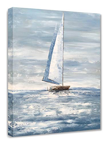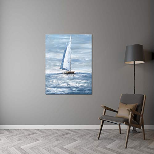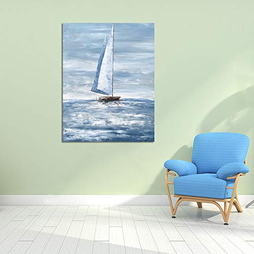 Yihui Arts - ييهوي ارتس لوحة فنية جدارية قماشية بحرية - لوحة قارب شراعي - صور ساحلية تجريدية حديثة باللونين الازرق والابيض - عمل فني عمودي لغرفة المعيشة وغرفة النوم وديكور الحمام