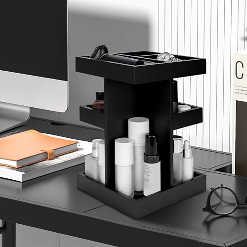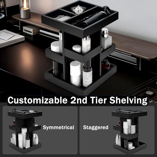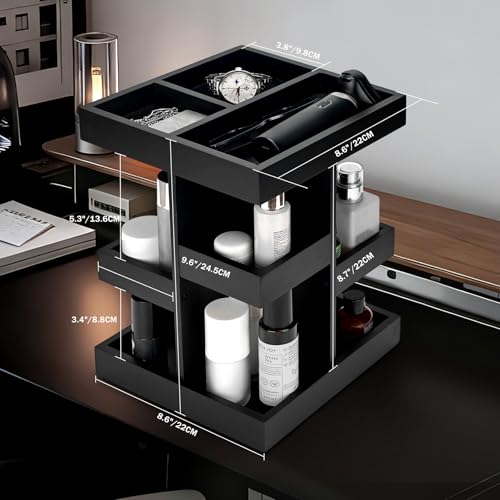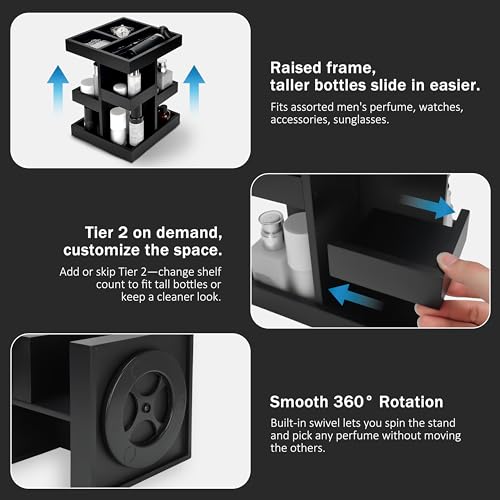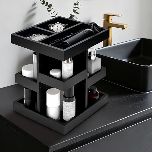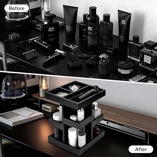 YINGXUN - منظم كولونيا للرجال، حامل عطور خشبي من 3 طبقات مع درج دوار، سعة تخزين كبيرة لمنضدة المكتب (اسود)
