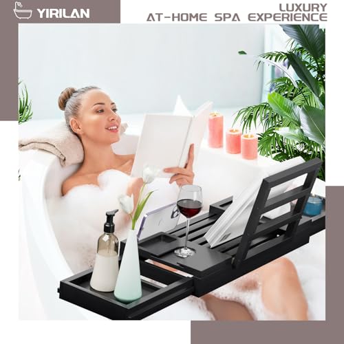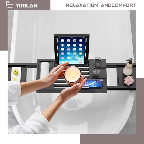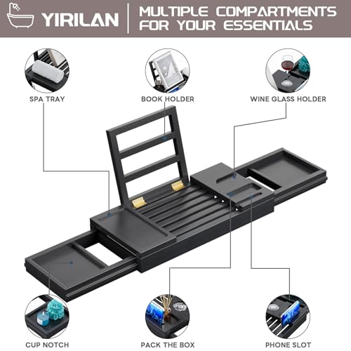 Yirilan - ييريلان صينية حوض استحمام من الخيزران، صينية حوض استحمام قابلة للتعديل، صواني حمام لحوض الاستحمام، علبة صينية مقاومة للماء، علبة حوض الاستحمام، هدايا فريدة من نوعها، اسود