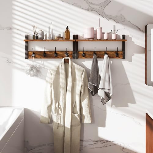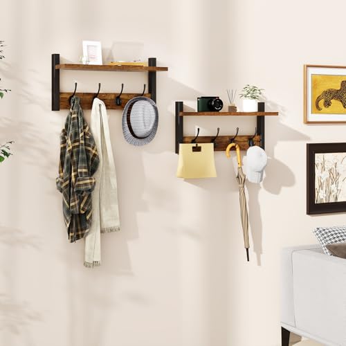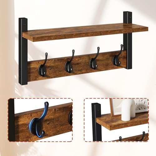 YMYNY - ياميني رف معاطف يثبت على الحائط، مجموعة من قطعتين، شماعات معطف للمدخل مع 4 خطافات مزدوجة، رف عائم على الحائط 80 سم مع رف للقبعات، للمطبخ وغرفة النوم والحمام، بني ريفي HWS001H-2، خشب مُصنع