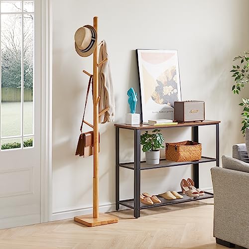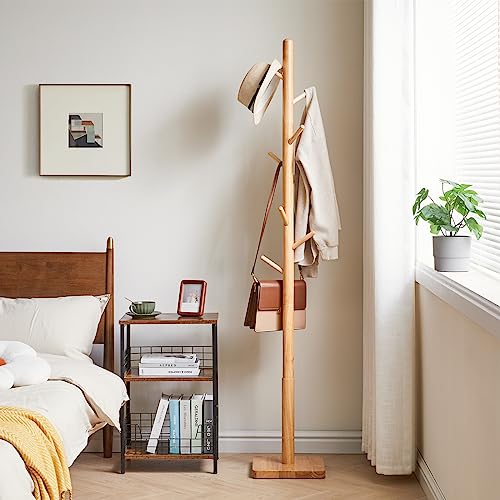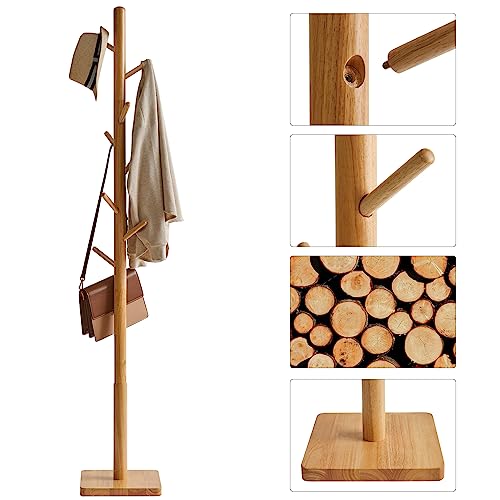 YMYNY - حامل معاطف بقاعدة مربعة من ياميني شجرة خشبية بقاعة قائمة بذاتها مع 8 خطافات ملابس للمعاطف والقبعات وشنطة اليد والمظلة للمكتب والرواق طبيعي HCR002N-Z