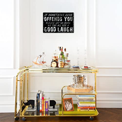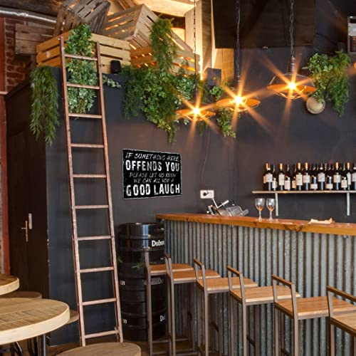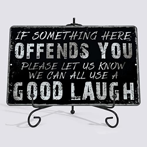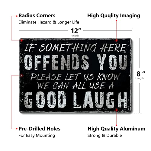 Yniaun Decor - لافتة معدنية ديكور بتصميم عصري ساخر بعبارة "if Something Here Offends You Please Let Us Know We Can All Use a Good Laugh" لتزيين ديكور حائط الجراج والمنزل والبار وغرفة عرين الرجل من ينيون، 12×8 بوصة