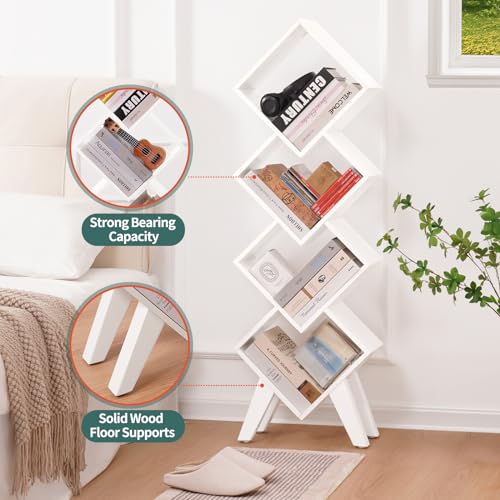 Yoobure - يوبور رف كتب ابيض خزانة خشبية صغيرة من 4 طبقات لغرفة النوم خزائن طويلة ارفف عصرية قائمة على الارض للاقراص المضغوطة - الكتب في المساحات الصغيرة غرفة المعيشة المكتب المنزلي خشب مُصنع