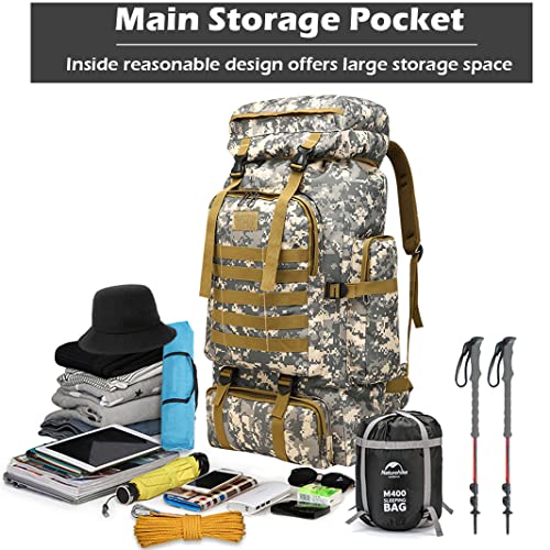 - حقيبة ظهر للرحلات بسعة كبيرة: 80 لتر حقائب ظهر للمشي لمسافات طويلة بسعة كبيرة. تتضمن مساحة تخزين رئيسية واحدة وجيب واحد بغطاء وجيب أمامي طويل بسحاب وجيب سفلي وجيبين جانبيين بسحاب. مساحات تخزين متعددة وسعة معقولة تساعدك على تنظيم أهم الأدوات والمعدات حسب الحاجة.