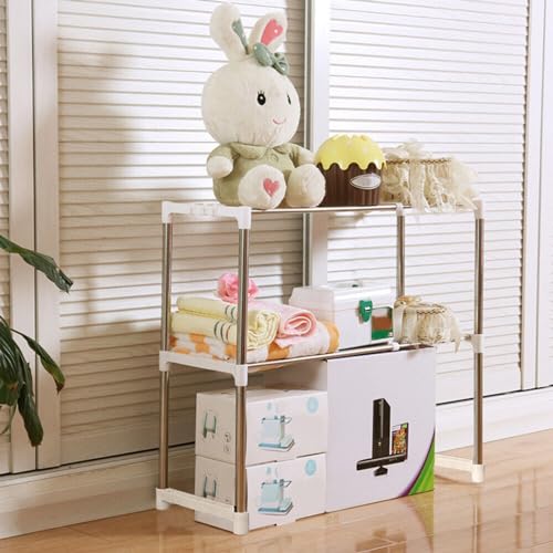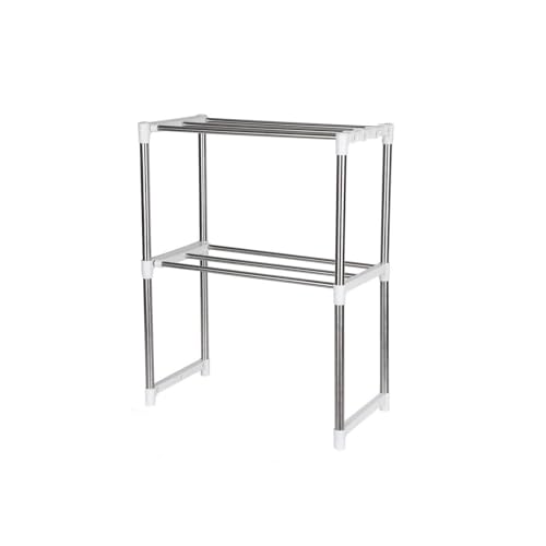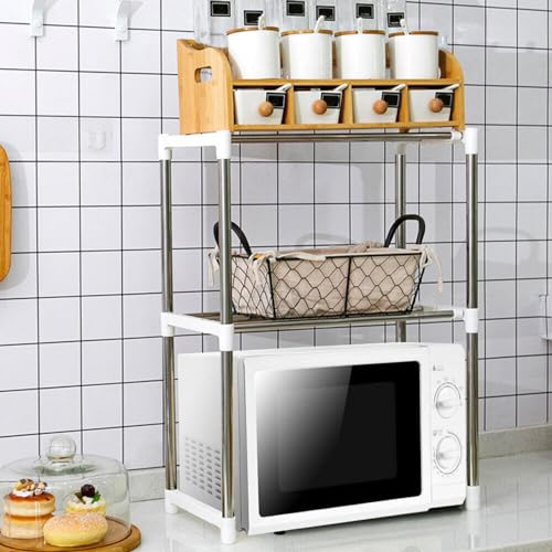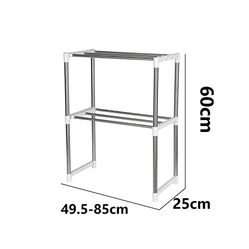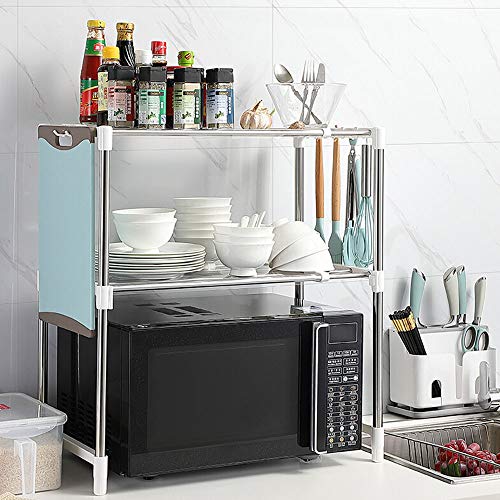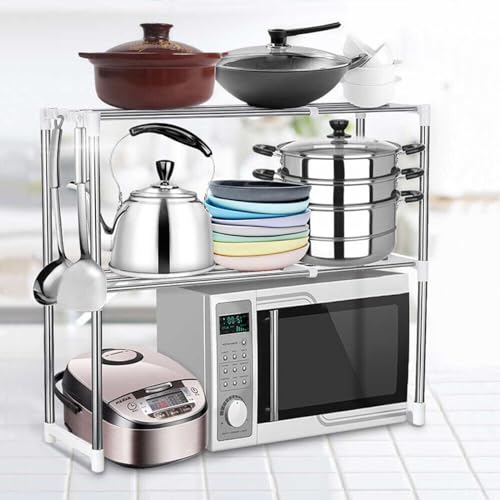 YORKING - رف تخزين فرن الميكروويف بطبقتين من الستانلس ستيل يوركينغ ميكروويف قابل للتوسيع مع 4 خطافات حامل منظم للمطبخ يوفر المساحة فضي