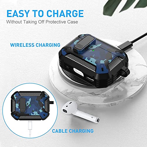 Generic - جراب موبايل من يوسكن لايربودز برو جيل 2022 حماية صلب متين الياف كربونية لابل اي بود 2 مع حامل بقفل وسلسلة مفاتيح للنساء والرجال ازرق مموه